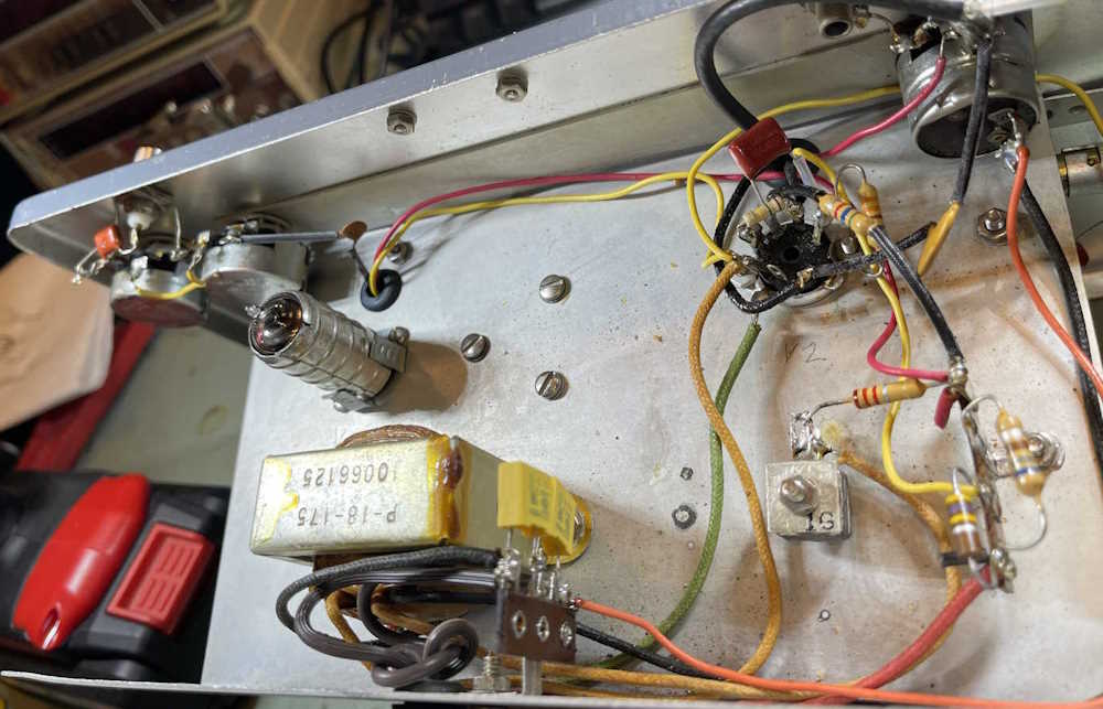 Second - I didn’t have any audio on the audio side. This turned out to be a part the previous owner installed. The grid of the audio oscillator was supposed to have a 100kΩ resistor, The previous owner had a 15kΩ resistor here, which is what I replaced it with as I replaced each component individually with it’s modern equivalent. Once I put the proper value in the circuit and a new tube (the old one didn’t seem to work well) it came right up. It’s a bit off in frequency, but it’s not really of importance as it’s there for you to hear, not compare to the sounds of nature.