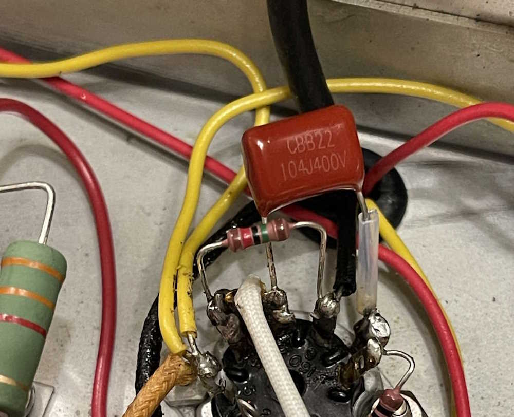 For the most part, this was just a replace the parts that are known to go bad (mostly done,) replace the carbon resistors because they will eventually go bad (mostly done,) and fix some of the issues left by the previous owner. The across-the-line capacitor was easy enough to replace with modern safety caps, and the old line cord was replaced with a new polarized cord.