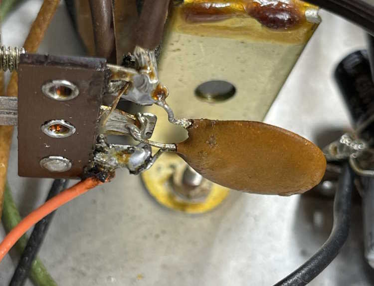 The across-the-line cap was of the three-leg type, a device that has two units back to back with a common leg. They’re well known for blowing apart, and that this one hadn’t done so was surprising. The other device was the original selenium rectifier.