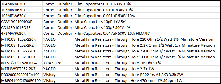 After going through and correcting the schematic, I now have a list of parts to order. The only one I don’t need is the 2.5K resistor that feeds the plate of the voltage regulator tube - I already have a small supply of 5W qualified parts, and will use one of those instead of buying more.