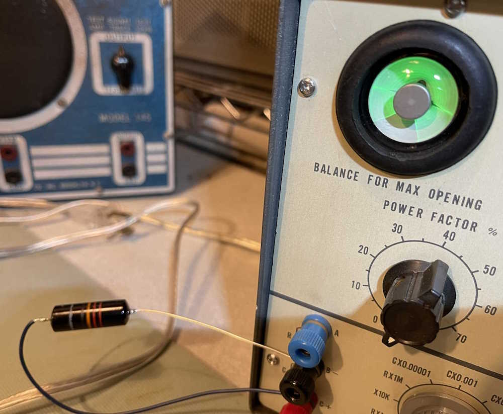 And here’s a bad shot of it testing an old dry electrolytic rated at 50μF - but actually reading 68μF on my good B&K capacitor checker. The dial is about 65ish, and the eye is open. Yep, that’s pretty good for an analog device with resistors that drifted farther out than the asteroid belt.