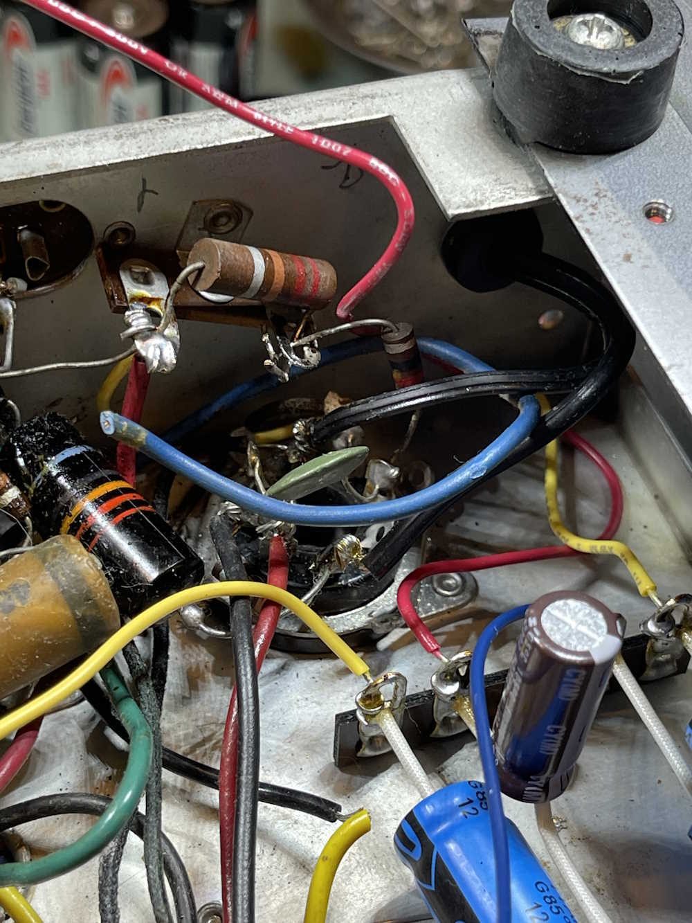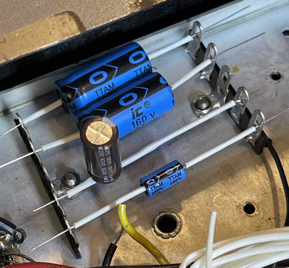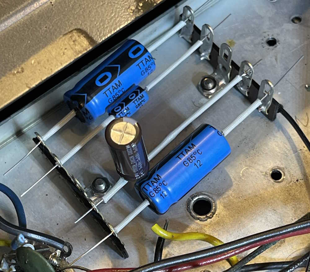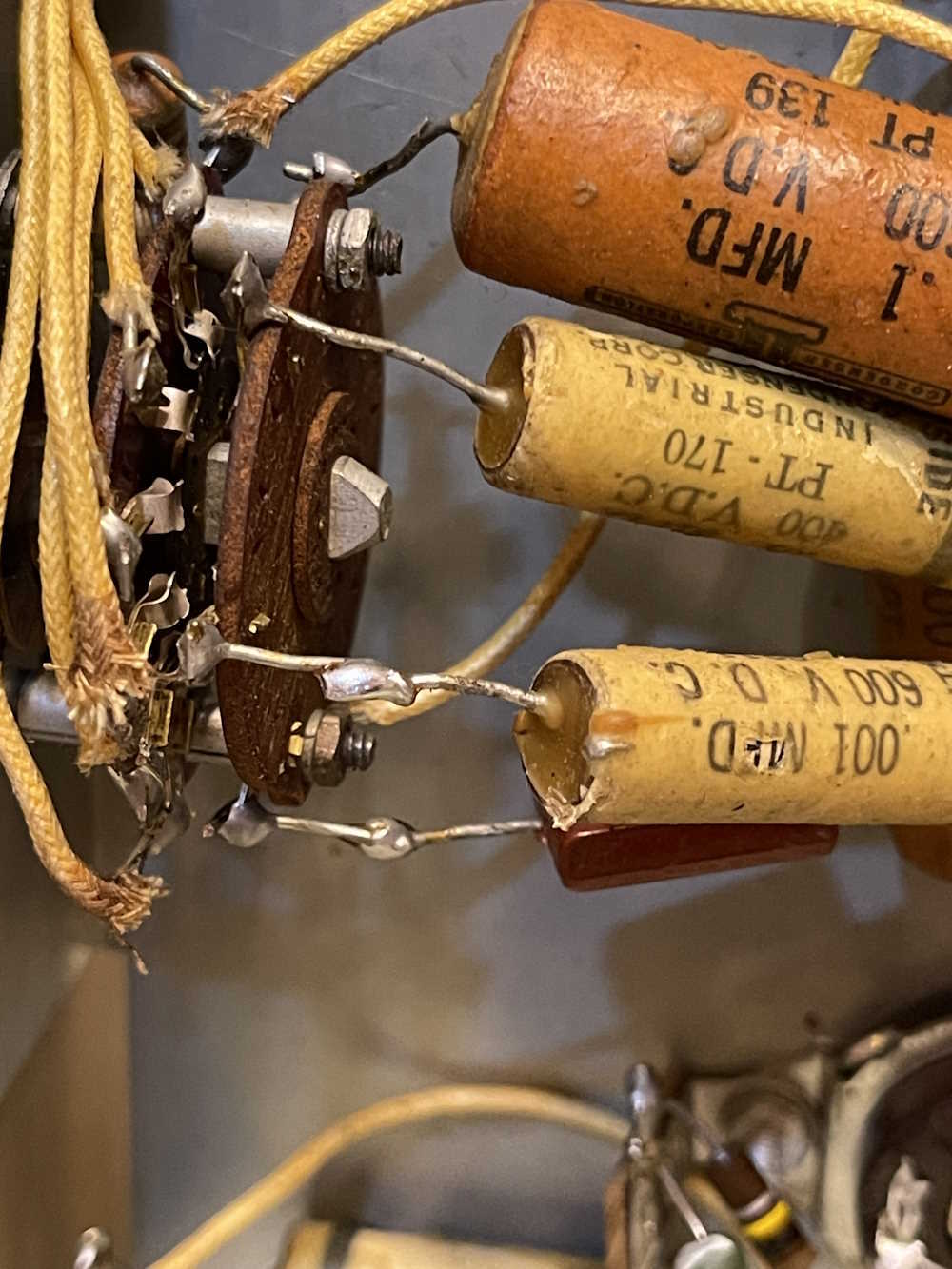 The original capacitor for this unit was a multi-unit paper tube, and I’m not going to dig the potting out of it to see if I can fit new parts inside. That’s just not going to work, and I don’t care about “looking original.” I decided to use the time-tested method of some solder lug strips and discrete capacitors.