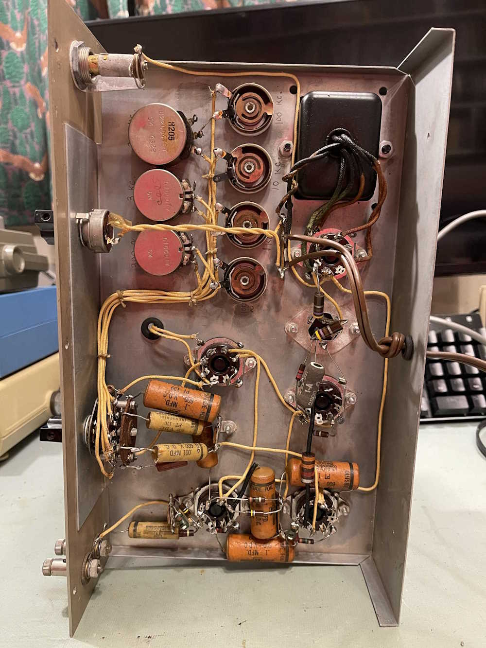 Nothing unusual here. The random array of drifted resistors and bad wax paper firecrackers adorns it. Of note are the adjustment pots - someone has replaced a handful of the 200Ω rheostats with 5k potentiometers. They’re of varying styles, so this was a junk bin build (or rebuild.)