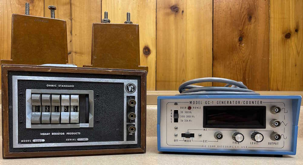 A Vishay decade box and a frequency counter / generator. They both seem to work well enough for the age. There’s also some high-voltage mica capacitors sitting on top of the decade box. Those were a buck, and I said why not?