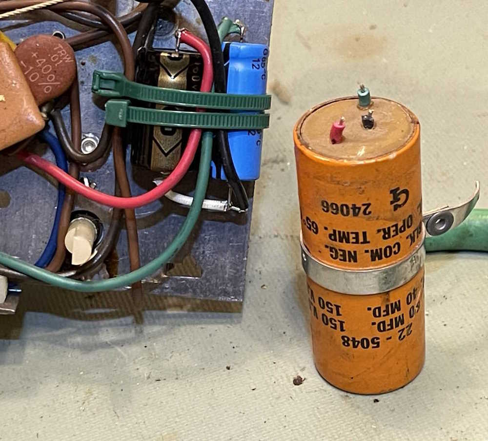 Next is to put the capacitor(s) in place. This is mostly just cutting out the old one and installing new. I decided to just leave them float on their wires since you’d have to throw the thing to bend the metal chassis. They’re tied together and tied to a cable bundle, so they aren’t going anywhere, and the electrons don’t care. Chassis is ground on this one, so even if it did go somewhere it would simply burn out the filament of the 35W4 which acts like a fuse.