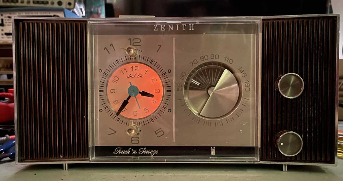The Zenith X184 doesn’t require much repair, just your typical old radio problems. So…first step is to gather the parts we need to do the repair. In this case, a 47μF and 100μF capacitor to replace the 40μF/80μF part, a neon bulb, and a 100kΩ dropping resistor for the neon bulb.