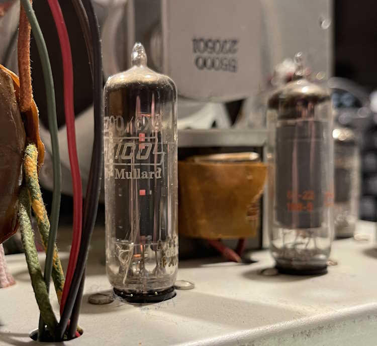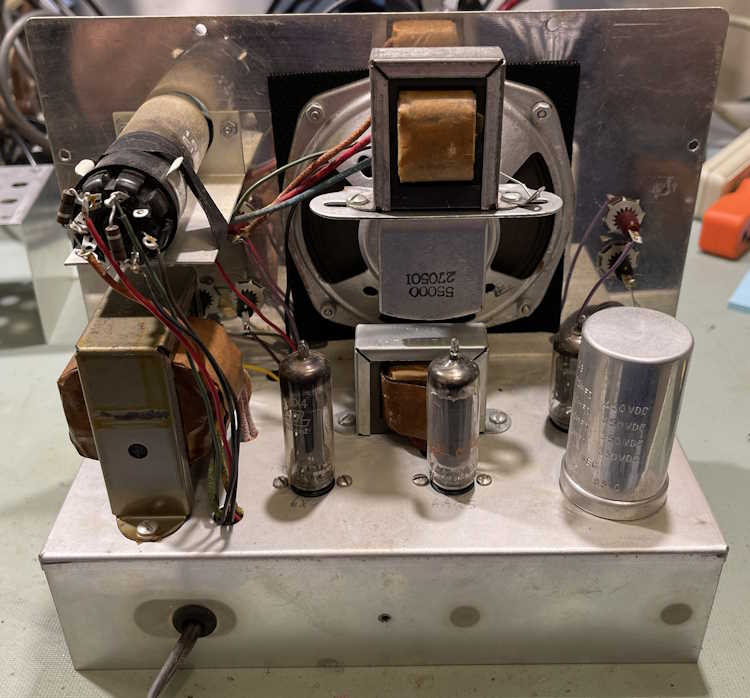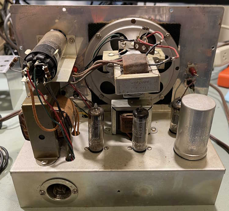 The inside of the unit is equally clean. Tube lineup is two original EICO branded tubes, along with a GE tube in the 6AQ5 position. As this is the power output, it was probably the first to go. Also of note here is the choke wrapping - it’s peeling away, but that’s not a big deal as that’s just the outer wrapper.