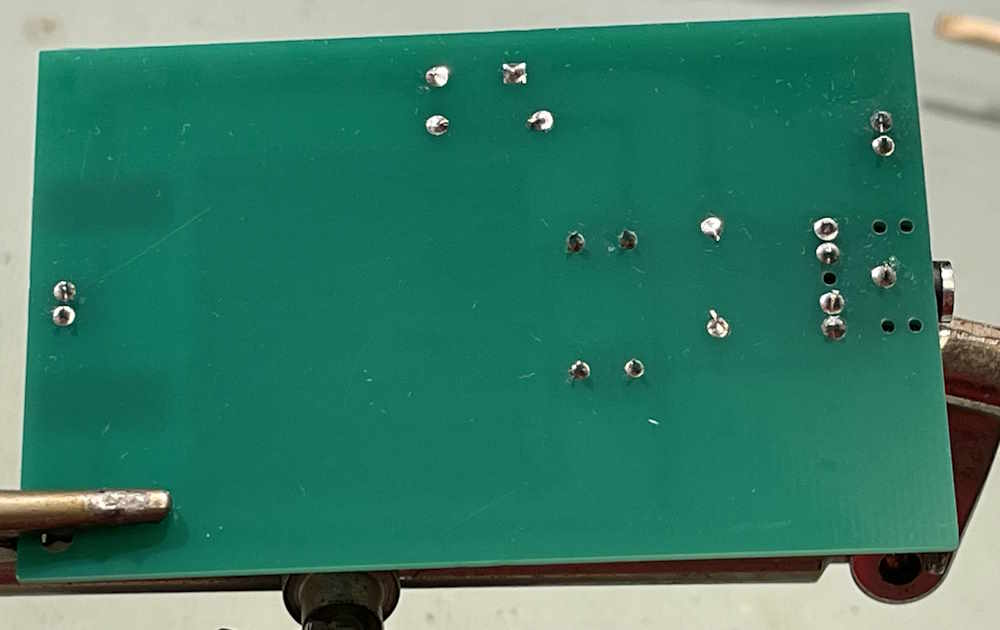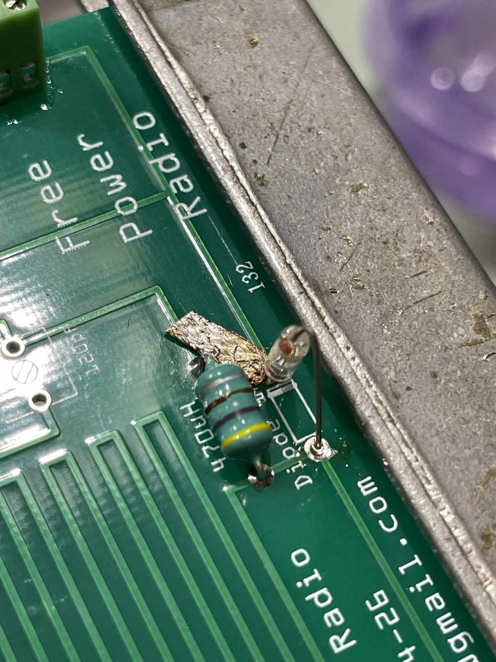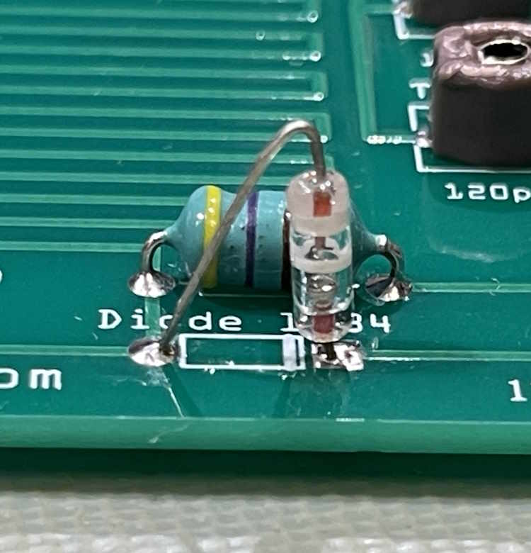 Germanium diodes are more sensitive to heat than other parts. While not as bad as they were back in the olden times, it’s still good to get in and get out as quickly as possible. I wasn’t terribly worried about a good top fillet here, the bottom is fine and I was quick about it. So…be quick, and be gone. Don’t let your iron linger.